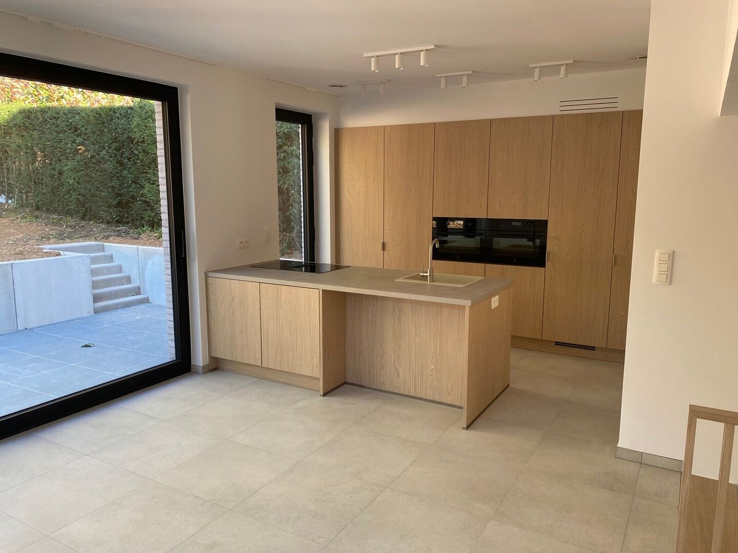 Rez-de-chaussée : Hall d'entrée, WC, séjour spacieux divisé en living et salle à manger avec cuisine ouverte entièrement équipée et accès vers la terrasse et le jardin.