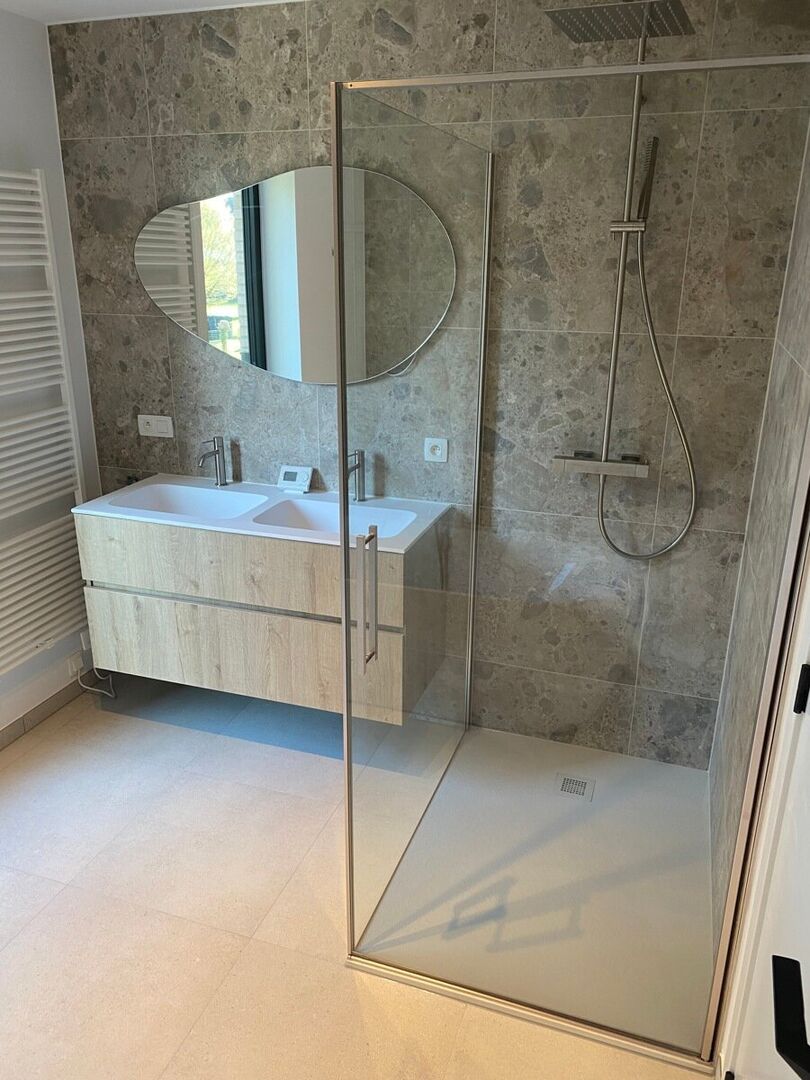 Premier étage : Hall de nuit, WC, grande salle de bains avec baignoire, douche et double vasque, et trois chambres, dont une chambre parentale avec dressing.