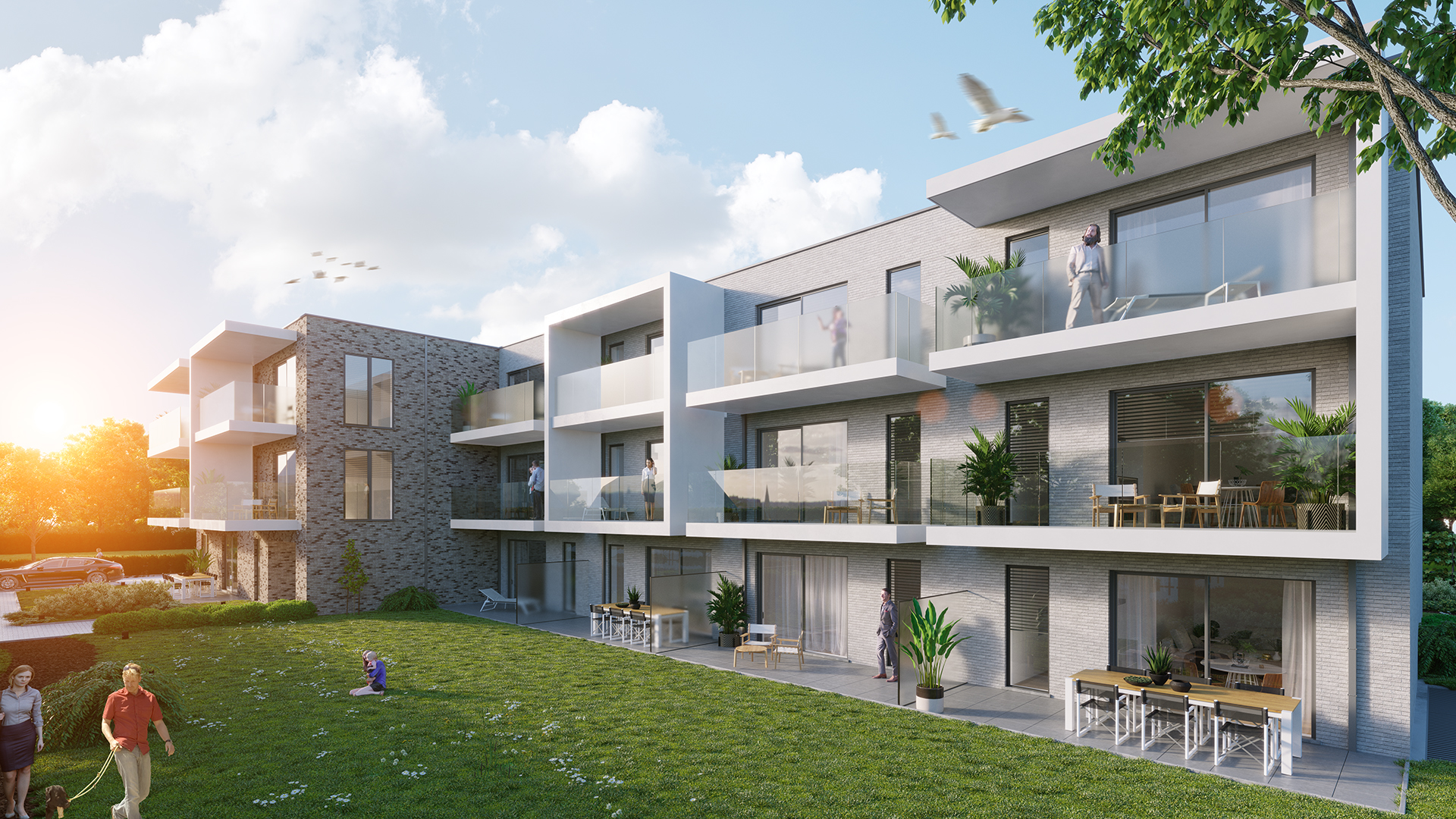 Inkomhal met ingebouwde vestiairekast, WC, living (26,11m2) met open volledig ingerichte keuken (8m2), ruime bijkeuken / wasplaats (4,31m2) en terras (Zuid-West) met zicht op de gemeenschappelijke tuin. 2 slaapkamers (11,82m2 en 10,20m2) en badkamer met inloopdouche.