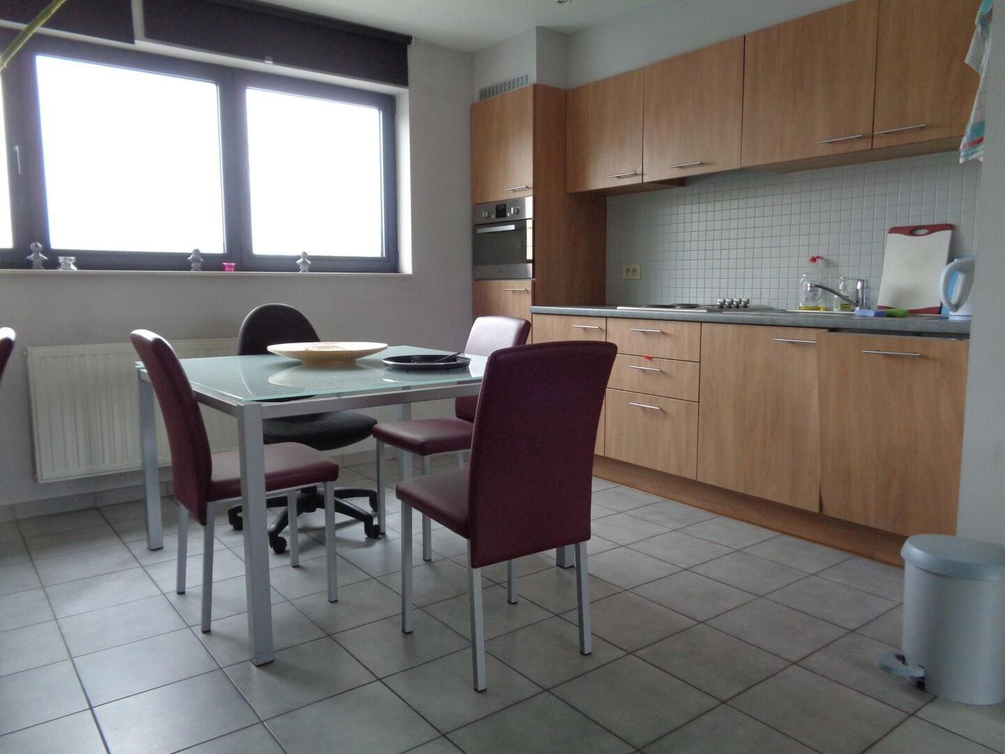 Ruime living (31,61m²) met open ingerichte keuken (elektrisch fornuis, microgolfoven, vaatwasser en koelkast) en terras (15m²).