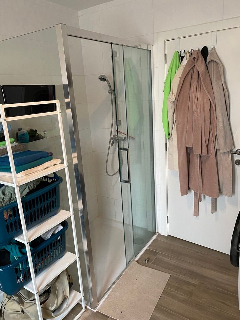Gelijkvloerse verdieping: Inkomhal, ruime slaapkamer, badkamer voorzien van douche, WC en dubbele lavabo in meubel.